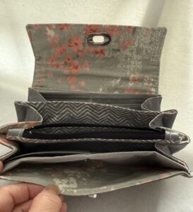 This versatile must have wallet is an essential accessory. It has 12 credit card slots with a zipper pocket and extra pockets behind the card slots on each interior side. Has plenty of room inside for cash or other small items.