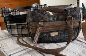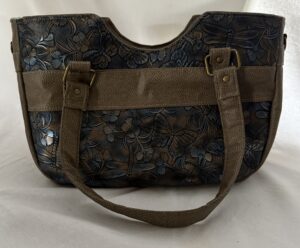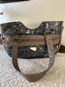 This Isla is made of vinyl exterior and cotton interior. It has a full zipper pocket exterior and zipper pocket interior and dual slip pocket. It comes with a cross-body strap that is removable and two shoulder straps. Alot of room inside. It has a matching mini NCW wallet in the dragonfly print available separately.
