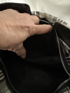 This purse will surely become a favorite of yours in your accessory closet. It is mostly cotton with black vinyl throughout the exterior. With a full length zipper pocket across the front is handy to keep easy to reach items. Interior is cotton with a dual slip pocket and a zipper pocket. Very roomy inside…