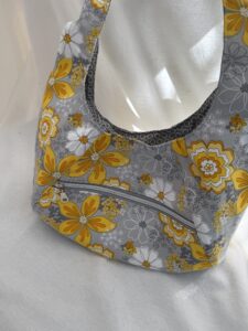 This everyday bag is complete with interior dual slip pockets and one exterior large zipper pocket. Has a lot of room inside. Made totally of cotton. Closure is a magnetic snap.