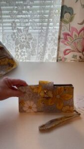 All cotton wallet matching the yellow Tobina, zipper coin pocket, storage compartments and credit card slots. Comes with wristlet.